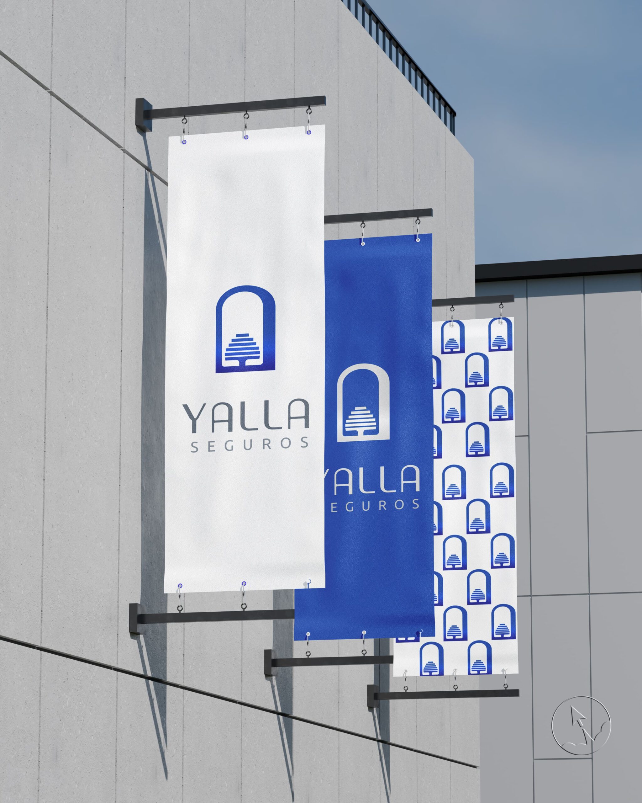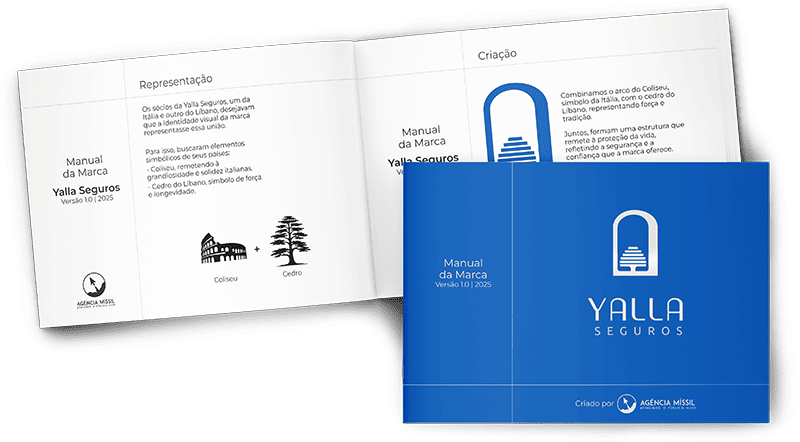 Os sócios da Yalla Seguros queriam uma identidade visual que simbolizasse a união de suas origens, representadas pelo Coliseu e pelo Cedro do Líbano. Criamos uma composição onde o arco do Coliseu envolve o Cedro como uma redoma, formando uma estrutura que transmite proteção, segurança e confiança.